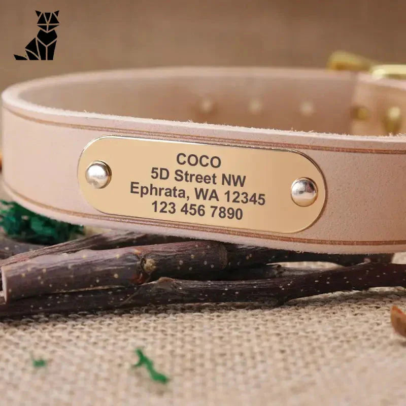 Glæd din vovse med vores storslåede personlige brede læderhalsbånd i beige og med guldspænde og ring